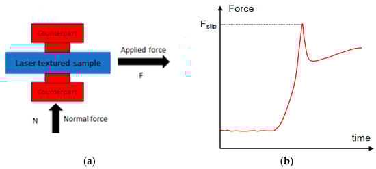 (a) Schematic of the static friction coefficient testing setup. (b) Typical plot of force as a function of time during the test.