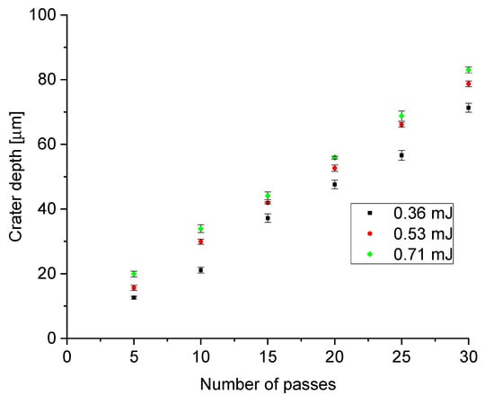 Crater depth as a function of the number of laser passes for three different pulse energies. Results presented for the 20 W laser.