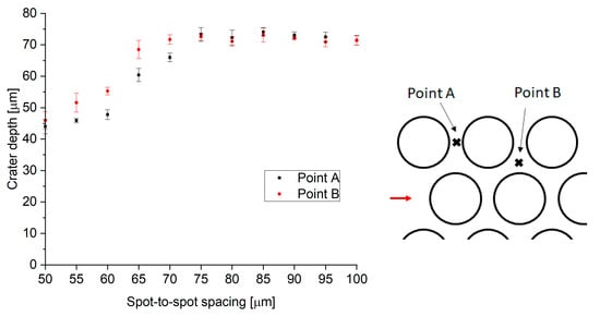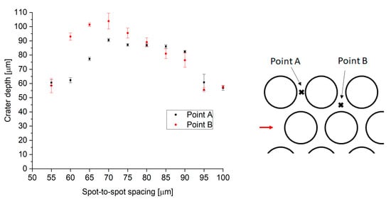 The results presented in Section 3.2 indicate that a spot-to-spot spacing of around 80 µm would create the most uniform surface and, as a result, provide the most uniform contact between the surface of the sample and the counterpart. This is confirmed when looking at the trend in Figure 12. For multiple crater depths, the best results were obtained for a spot-to-spot spacing of around 80 µm, where the texture has the most uniform (height of peaks in point A and point B is most similar) top surface. Figure 12 shows the coefficient of static friction as a function of spot-to-spot spacing for both 20 W and 200 W lasers.