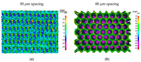 Figure shows the topography of laser structures with (a) 50 µm and (b) 80 µm spot-to-spot spacing.
