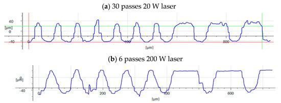Cross-section surface profile of topographies achieved by the 20 W laser (a) and 200 W laser (b).