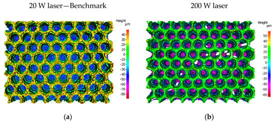 Comparison of the surface topographies for processing with 20 W laser (a) and 200 W laser (b).