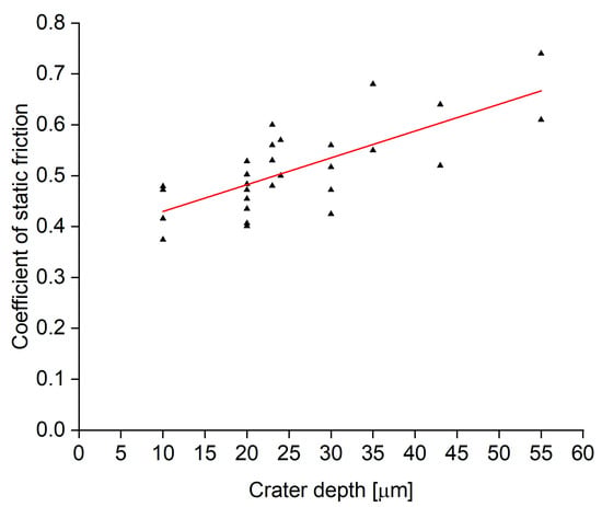 Static friction coefficient as a function of crater depth. The results presented here were obtained with both the 20 W and 200 W lasers. Results include various spot-to-spot spacings. The results for the same crater depth are for a range of different spot-to-spot spacings, hence the spread of coefficient of friction values.