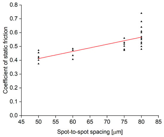 The requirement for the high-friction rings is to have a coefficient of static friction of at least 0.60 to fulfil their function within the driveshaft assembly. Static friction measurements were made across the full range of laser parameters tested, and these are grouped in the plots shown in Figure 11 and Figure 12, where the coefficient of friction is presented as a function of the pattern height and spot-to-spot spacing, respectively. The results shown in Figure 11 indicate a clear linear trend, in that an increased peak height leads to an increased coefficient of static friction.