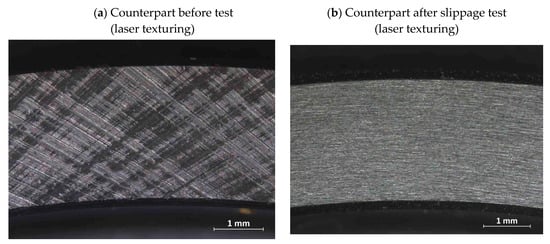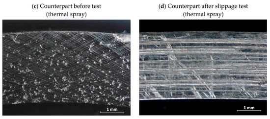 Images of counterparts that are in contact with the high-friction rings before and after slippage test. (a) Counterpart before slippage test (laser texturing)—no visible indentations by pressing of the laser textured part. (b) Counterpart after slippage test (laser texturing)—The surface of the counterpart after the slip test with laser- textured and hardened part exhibits a uniform surface without any dominant features. (c) Counterpart before slippage test (thermal spray)—The bright spots are indentations created by pressing of the thermal-sprayed part into the counterpart, indicating uneven, large structures created by the coating. (d) The surface of the counterpart after the sliptest with the thermal-sprayed sample exhibits large scuff marks and scratches created by the thermal-sprayed surface.