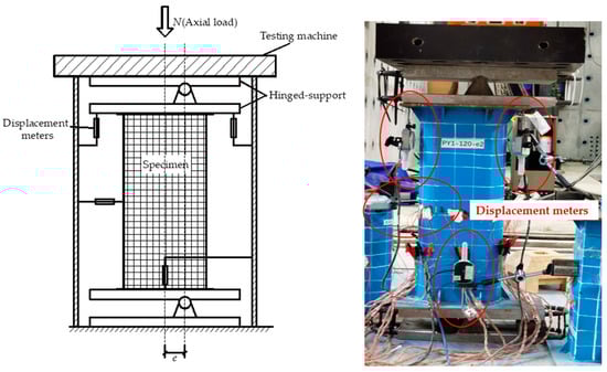 Figure 2 shows the part of the specimens during preparations and the WAW-J10000 electro-hydraulic servo multifunction structure testing machine. The distances between the top-hinged support and the centerline of the testing machine, and the bottom-hinged support and projection on the ground of the centerline of the testing machine were measured to ensure the correct location of eccentric loads. The displacement loading with an initial speed of 0.5 mm/min was adopted and increased to 1 mm/min after the testing machine had been stabilized. The speed was slowed down to 0.3 mm/min when it neared the bearing capacity, to prevent lateral overturn of the specimen due to sudden unloading. The load was stopped when the weld cracked or axial deformation reached 3%. Three displacement meters were used to measure the displacement of the top and bottom hinged supports; the deflection of the specimen at the mid-length of the specimen was measured by one displacement meter.