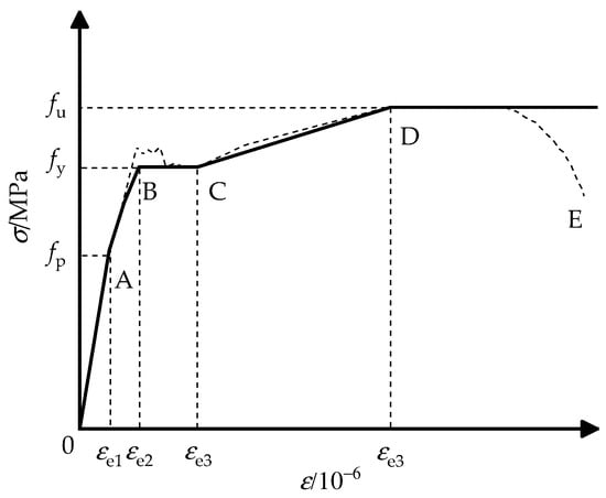 The tensile softening model from reference [15] was adopted for simulating the property of concrete under tension. As demonstrated in Figure 3, the stress–strain relationship [6] of steel proposed by Han includes 5 stages: OA for the elastic stage, AB for the elastic–plastic stage, BC for the plastic stage, CD for the strain hardening stage, and final plastic deformation after point D.