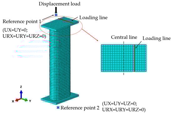 The FEM was established in ABAQUS. A 3D 8-node solid element, C3D8R, was selected for concrete and the rigid plate; a 3D 4-node shell element, S4R, was selected for the steel tube. “Surface-to-surface” was selected for interactions between concrete and the steel tube, a penalty function with a 0.6 friction coeffective was used for the tangential behavior, and “Hard” contact for the normal behavior. “Shell-to-solid-coupling” and “tie” were applied for the rigid plate with the steel tube and concrete, respectively. A mesh size of 15 mm was adopted for the hole model to ensure accuracy and calculate speed. After the mesh procedure, 19,036 to 23,248 nodes and 15,608 to 19,464 elements were produced. Figure 4 displays the FE model; the eccentric loading was simulated with boundary conditions, the loading line was coupled with a reference point which was constrained in the x and y directions so that it could move in the z-direction, and the plate at the bottom of the column was constrained in x, y and z directions.
