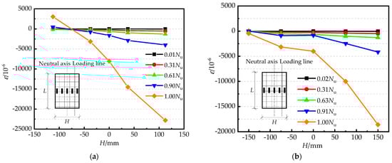 Figure 5a,b presents the axial strain along with the height of the cross-sections at the mid-length of specimens PY0.5-180-e2 and PY1-180-e1-Q235. The changes in the steel tube strain along the normal section of specimens confirm the plane-section assumption [27]. A large increase in strain occurred at loads at 1.00 Nu, which possibly corresponded with the development of local buckling at the mid-length.
