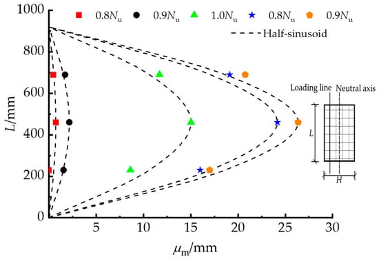 Figure 6 displays a typical lateral deflection curve for PY1-180-e1-Q235 at various load levels; μm is the lateral displacement and Nu is the peak axial load. The curves were in good agreement with the half-sinusoid curves. It is feasible to predict the peak load and lateral deflection of the RRCFST columns under eccentric compression.
