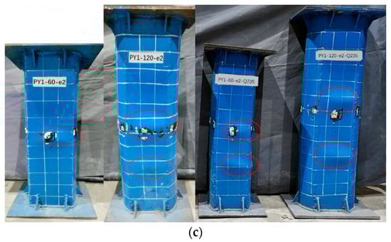 Comparing the failure modes of PY0.5-180-e1-Q235, PY1-180-e1-Q235 and PY1.5-180-e1-Q235 in Figure 7b, the lateral stiffness of columns with the same θ value are enhanced with the increased cross-sectional area, although local buckling still occurred at the end because of stress concentration. However, a narrower range of local buckling and lower buckling amplitude occurred in columns in Figure 7b compared with the columns in Figure 7a. It is hypothesized that a lower aspect ratio contributes to delaying the local buckling and improves the confinement of steel tube on concrete.