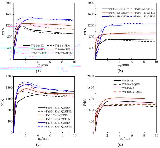 The axial load (P/kN) and mid-length lateral displacement (μm) curves are exhibited in Figure 8. The initials EX and FEM stand for experimental and finite element model findings, respectively. FEM ignores the specimen’s original defects; thus, the FEM curves in the elastic–plastic range are somewhat higher than the experimental curves in Figure 8a–c.