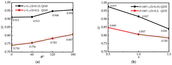 Figure 9 depicts the SI of each specimen based on several parameters. As can be seen in Figure 9a, the SI increased as the degree of the central angle increased. SI, i.e., material utilization, rose by 0.2 to 3% for every 60° increase in central angle, which was particularly noticeable when the eccentricity was large. This also shows that the confinement effect in the round-ended part and the material efficiencies of steel and concrete in RRCFST columns improved with the increased central angle when they are subjected to eccentric load. On the other hand, Figure 9b shows how differing cross-sectional aspect ratios affect the SI. The cross-section tends to be rectangular when κ is raised, resulting in fewer constraints for the steel tube and concrete and a loss in material efficiency; the SI reduces by 2.7% to 8.3% for a 0.5 increase in aspect ratio. Figure 9a,b demonstrates the concept that the cross-section tends to be circular when the aspect ratio falls with the central angle increase and leads to enhanced confinement effects of concrete from the steel pipe, and high material utilization. Furthermore, with the increased eccentric ratio, the bearing capacity of columns is diminished due to the combined effect of axial load and enlarged moment. Moreover, the trend in SI is less affected by an eccentric ratio as an external cause. With a different eccentric ratio, the change in SI remains higher as the central angle increases and the aspect ratio decreases.