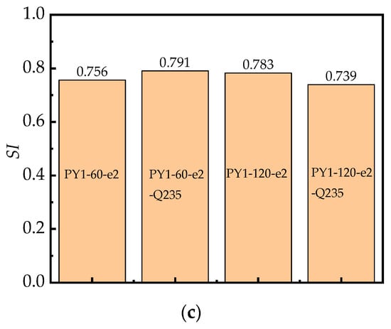SI results for columns with various steel strengths are presented in Figure 9c. The results reveal an unknown regular pattern for SI as the steel strength changes. This is probably due to the strong association between the steel tube and concrete. Material utilization does not change substantially with minimal variation in the strength of concrete and steel tube. As a result, for the design of RRCFST columns, the strong relationship between the steel tube and concrete should be further investigated.