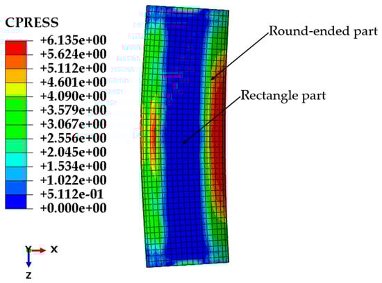 The eccentric bearing capacity of RRCFST columns greatly depends on the confinement effect of the steel tube on concrete, and the confinement effect can be quantitatively illustrated by the interfacial stress between the steel tube and concrete [19]. However, the interfacial stress was hard to measure in this experiment. In this study, “contact stress” from the FEM is used to represent the interfacial stress between steel tube and concrete, and the confinement effect is analyzed. Based on the FEM results, the interfacial stress contour distributions of PY1-180-e1-Q235 have been produced and are destroyed in Figure 10. The biggest stress occurs at the compressive area and the corner where the straight and arc edges join. The large region in the rectangular part contains similar and comparable interfacial stress.