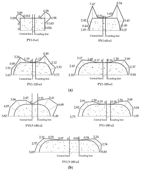 Figure 7 gives the failure modes of columns at the front and corresponding compressive side after eccentric compression experiments. Most eccentric compression specimens fail due to the steel tube buckling and crushing of the concrete. However, the shear failure mode is observed in PY1-0-e1 with weak confinement by the outer thin-walled steel tube [19,28]. For specimens in Figure 7a, with central angles from 0 to 180°, local buckling developed from the mid-length to both ends and from the round-ended part to the rectangular part. This was probably due to the increased local confinement effect at the round ends in the presence of a large θ. The confined effect of different central angles is discussed in Section 3.4. In addition, when the central angle was increased from 120° to 180°, the lower steel strength had only a minor impact on the lateral deformation and failure mode of the RRCFST. However, buckling still occurred at the round-ended parts of PY1-180-e1-Q235 and PY1.5-180-e1-Q235, demonstrating that a larger central angle generates a more contained effect, but it is insufficient to compensate for the reduced material strength. According to the failure mode results in this research, these regular buckling types of RRCFST stub column failure which can be observed are attributed to the influence by the regular θ changes.