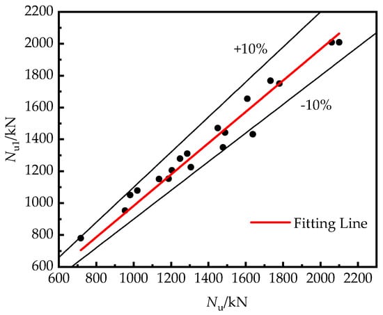 Due to the lack of eccentric bearing capacity for RRCFST columns with different central angles, the experimental results in this study were used for examining the feasibility of Equation (9), and are described in Figure 12. A good fitting level is exhibited. This provides a simple calculation method for presenting the bearing capacity of RRCFST stub columns with different central angles under eccentric compression load.