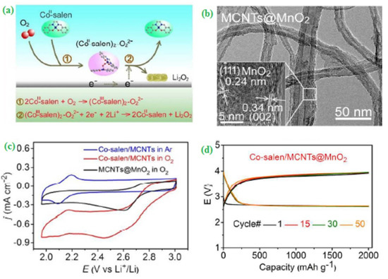 Synthesis and analysis of Co–salen/MCNTs@MnO2 (a) Schematic illustration for the reaction mechanism of the LABs with CoII–salen in the electrolyte during discharge and charge process, (b) TEM images of MCNTs@MnO2, (c) Cyclic voltammograms obtained for ORR at a scan rate of 10 mV s−1 and (d) Discharge/charge profiles for Co–salen/MCNTs@MnO2 at 500 mA g−1 with the cut-off capacity of 2000 mAh g−1. Copyright 2017 by American Chemical Society [45].