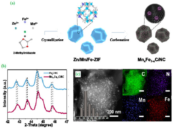 (a) The schematic diagram for the fabrication process of MnxFe3-xC/NC catalyst, (b) XRD patterns of Fe3C/NC and Mn0.9Fe2.1C/NC, (c) STEM image with its corresponding elemental mappings for C, N, Mn, and Fe of the Mn0.9Fe2.1C/NC catalyst. Copyright 2019 by American Chemical Society [48].