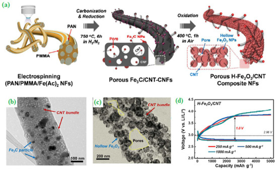 Moreover, Jung et al. [50] fabricated and studied ORR and OER activity of hierarchically structured CNT based hollow Fe2O3 nanoparticles by the electrospinning method using polyacrylonitrile (PAN) as a precursor and poly(methyl methacrylate) (PMMA) as co-polymer (Figure 4a). The randomly mixed nano-onion H-Fe2O3/CNT NFs composite with an average particle size thickness value larger than 50 nm was analyzed by TEM (Figure 4b,c). In this connection, the constructed H-Fe2O3/CNT NFs composite showed an outstanding cell performance (specific capacity = 1000 mAh g−1@500 mA g−1) with a long life cycle (250 cycles) (Figure 4d). A multi-metal (Fe, Co, Cu and Zn) blended zeolite imidazole framework (ZIF) via a simple redox reaction route was proposed to develop a novel bifunctional electrocatalyst for ORR and OER. After the pyrolysis process, a highly porous carbon polyhedron (FC-C@NC) was obtained. The catalyst delivered a discharge capacity of 659.5 mAh g−1 at a current density of −4.66 mA g−1 with a good cyclic stability [51].