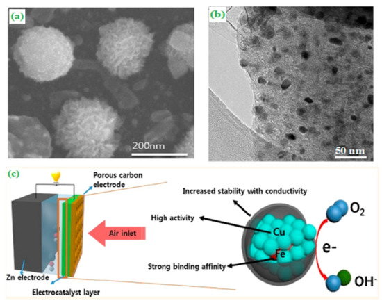 The paralysis technique was employed to synthesize the noble-metal-free and nanoscale-based transition metal oxide CuFe alloy coated core-shell structured graphitic carbon electrocatalyst. The morphological structure of CuFe supported graphitic carbon was evaluated by SEM and TEM analysis. The as-prepared electrocatalyst has been displayed as nanoscale-based metal alloys, and the coated graphitic carbon looked like a ball-like structure (Figure 6a,b). The core-shell based morphological electrocatalyst has a moderate binding strength and also catalytically influenced their charge-transfer process in the rechargeable metal-air battery (Figure 6c) [60].