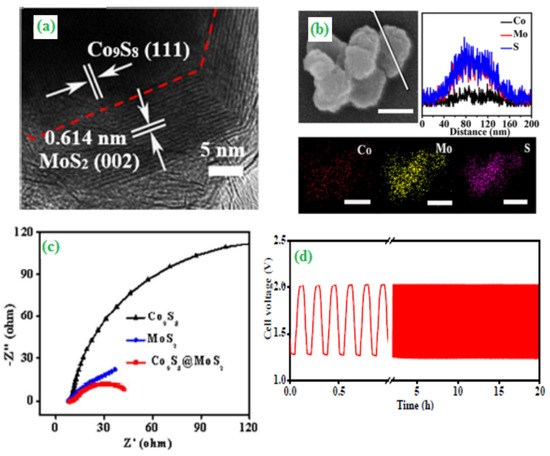 (a) HR-TEM image of the Co9S8@MoS2, (b) FE-SEM image (scale bar: 100 nm), corresponding cross-sectional compositional line-scan profiles and elemental mapping of the Co9S8@MoS2, (c) EIS plots recorded at −0.143 V and (d) Galvanostatic charge-discharge cycling at a current density of 10 mA cm−2. Copyright 2018 by American Chemical Society [63].