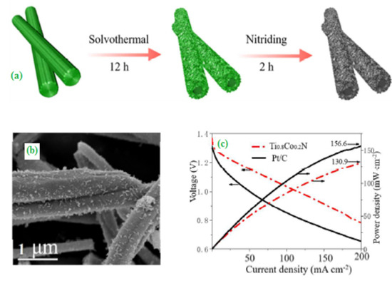 (a) Schematic diagram for the preparation of titanium nitrides assemblies, (b) SEM image of TiOSO4 precursors formed at 4 h reaction time, and (c) Polarization and power density curves for Ti0.8Co0.2N. Copyright 2018 by American Chemical Society [74].