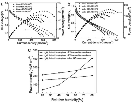Polarization and power density of single cells developed an 80% HPW-meso-silica nanocomposite membrane in (a) H2/O2 and (b) H2/air at 80 °C under various relative humidity (RH) values. (c) The plot of the dependence on RH of the maximum power density of cells with 80% HPW-meso-silica and Nafion 115 membranes. Copyright 2011 by American Chemical Society [80].