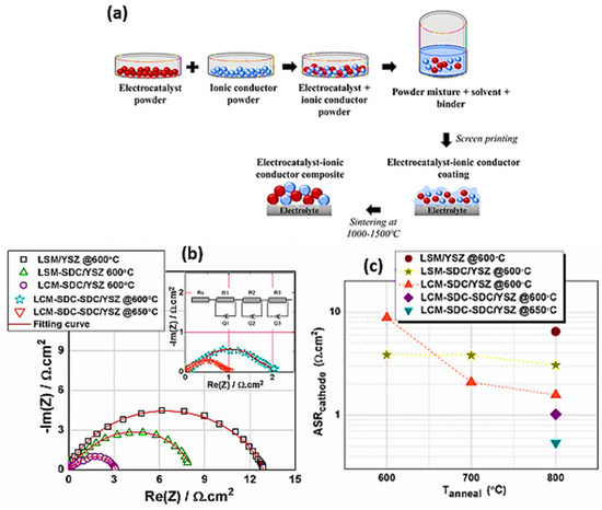 (a) Schematic illustration for the fabrication of composite cathode using powder-based precursors. (b) The Nyquist plot was obtained for LSM, LSM–SDC, and LCM–SDC thin film on YSZ substrates at 800 °C for 3 h and tested at 600 °C. The inset in (b) displays the LCM–SDC thin film on the YSZ substrate with an SDCinterlayer. (c) Polarization resistance of the fabricated thin films. Copyright 2019 by American Chemical Society [91].