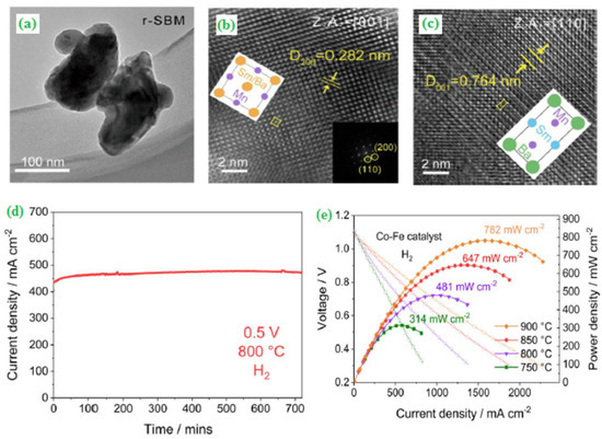 (a) TEM image of r–SBM, (b) Zone axis of 001 planes, (c) Zone axis of 110 planes, (d) Short term stability for the symmetrical cell under a constant voltage load of 0.5 V in humidified H2 at 800 °C, and (e) Current-voltage and power density curves for the symmetrical SBM electrode in the presence of humidified H2, anode side infiltrated with 15 wt% Co–Fe catalysts. Copyright 2019 by American Chemical Society [94].