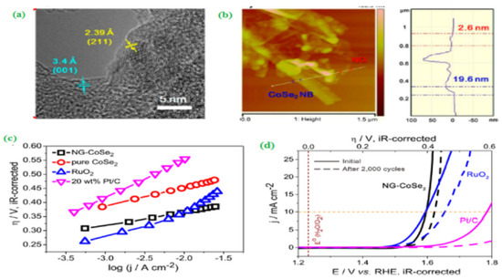 (a) HR–TEM image of CoSe2 nanobelt, (b) AFM image and corresponding height profile of NG-CoSe2 composite, (c) Tafel plot, and (d) OER polarization curves of NGCoSe2 composite, RuO2, and 20 wt % Pt/C catalysts before and after potential sweeps (0.3–0.8 V vs. Ag/AgCl) for 2000 cycles. Copyright 2014 by American Chemical Society [98].