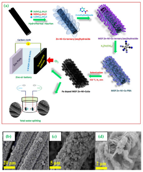 Mutharasu et al. [115] constructed a well aligned Fe-doped MOF-framework-based ZnNiCoSe@CC nano-shell catalyst with high surface area and excellent electrical conductivity through the hydrothermal route (Figure 13a). Low and high-magnification FE-SEM images of the developed catalysts are shown in Figure 13b,c. It was found that the hierarchical architecture was extremely porous, while the integration of selenium was due to nanocrystal formation. The developed porous structure renders good mass transport and mechanical stability, which prevents aggregation of 3D domains. Further, the incorporation of Fe can alter the morphological and electronic structure of catalysts.