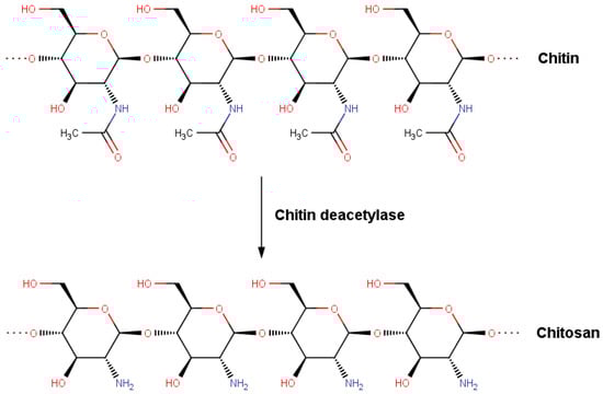 Deacetylation of chitin into chitosan.