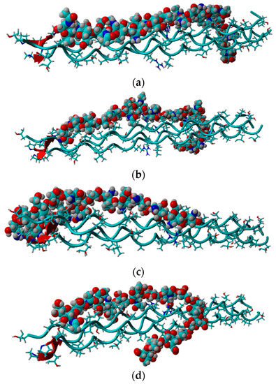 This study analyzed the intermolecular interactions between chitosan and collagen type III using molecular docking methodology followed by molecular dynamics simulations. Additionally, the affinity of chitosan to the target protein was compared with HA. The collagen type III secondary structure is characterized by the dense helical shape (homotrimer). The collagen helix is stabilized by the strong N-H(GLY) ⋅⋅⋅ O = C (Xaa) hydrogen bonds [85]. Due to this ordered and compact structure, the intermolecular interactions with other bio-polymers can be formed by the side groups in the peptide chain. The exemplary structures of complexes characterized by a different chitosan deacetylation degree (DD) were presented in Figure 2. As one can see, a completely deacetylated chitosan (DD = 100%, Figure 2c) exhibits a parallel orientation in relation to collagen contrary to hyaluronic acid and chitosan–collagen complexes characterized by lower DD values. Characteristic hydrogen bonds for low DD are formed mainly between the hydroxyl group and HYP/GLY/ARG. For higher DD more amino groups can form more H-bonds, primarily by GLY. The shortest distance between donor and acceptor formed by ARG is about 2 Å.