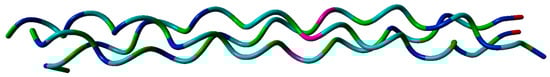 The optimized structure of collagen. ARG, GLY, and HYP amino acids are denoted by pink, dark blue, and green colors, respectively.