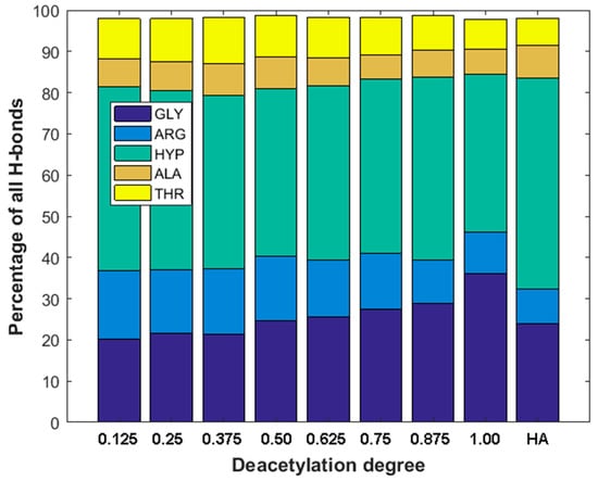 As one can see from Figure 4b,d, there is a very weak correlation between the number of ionic interactions and DD (R2 = 0.22) and practically no correlation in the case of the number of hydrogen bonds vs. DD plot (R2 = 0.01). This is understandable as the number of intermolecular interactions is only a very rough measure of the stability of macromolecular complexes [90]. On the other hand, the stability of collagen self-assemblies is related to the number of intermolecular interactions, mainly hydrogen bonds and electrostatic interactions [10,91,92]. It is worth emphasizing that both interactions are characterized by the highest contribution to the binding energy. When the DD is higher than 0.3, the number of hydrogen bonds is, in general, slightly higher than in the case of HA. The hydrogen bonds distributions corresponding to each collagen amino acid are presented in Figure 5. As one can see, in all cases, HYP is forming the highest number of hydrogen bonds. The highest percentage (44%) was observed in the case of 12.5% DD. Noteworthy, the total number of hydrogen bonds for the chitosan structures characterized by low DD (≤0.25) is relatively small (Figure 4b). Interestingly, in the case of DD = 62.5%, a decrease in the H-bonds can be observed. The fully deacetylated chitosan (DD = 100%) is characterized by the lowest number of hydrogen bonds and the highest affinity to the peptide (Figure 4a). However, it should be taken into account that DD does not affect significantly the number of collagen–chitosan H-bonds. The relative difference between the highest and the lowest average number of H-bonds is c.a. 6%. Therefore, the number of hydrogen bonds should be analyzed critically, and the distribution of individual contacts is more important from the collagen–chitosan affinity perspective. In the case of fully deacetylated chitosan, the highest distribution of hydrogen bonds was formed by HYP (44%). It is worth mentioning that HYP plays a crucial role in collagen helix conformational stabilization [93]. Therefore, it should be expected that chitosan will destabilize the tertiary structure of collagen. Indeed, the collagen–chitosan wide-angle X-ray scattering (WAXS) analysis of the 0.84 and 3.5 nm−1 regions showed that helix structure is less pronounced with the increase in chitosan, as evidenced by the intensity reduction of the peak corresponding to the intermolecular interactions between collagen chains [94]. This is understandable since the formation of new intermolecular interactions of chitosan with the peptide chain disrupts the triple helix system.