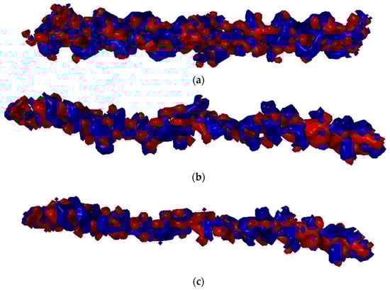 The ionic interactions were found only in the case of chitosan–collagen complexes, which can be explained by the proton transfer between zwitterionic amino acid moieties and the amino group in chitosan. The highest number of ionic interactions and hydrogen bonds was observed for DD = 75.0%. Interestingly, the number of ionic interactions is the lowest for DD = 100%. Furthermore, a slightly ascending trend for DD < 37.5% can be distinguished. It can be concluded that when the DD > 50%, the number of ionic contacts dramatically increases. This is a quite surprising observation, which confirms the complex polyelectrolyte nature of collagen. Noteworthy, another important property, namely water solubility, which is closely related to macromolecules’ polarity and electrostatic features, was also found to be significantly enhanced when DD > 50% [95]. However, in the case of fully deacetylated chitosan, the strong H-bonds employing amino groups much more predominantly contribute to the complex stabilization, which is probably caused by the close parallel orientation of chitosan and collagen (Figure 2c), posed by the lack of sterically hindering acetyl groups. Such an efficient assembly of chitosan and collagen macromolecules occurs only in the case of DD = 100%, which explains the abrupt change observed in Figure 4d. Figure 6 shows the electrostatic potential map of selected structures. Both collagen and chitosan are characterized by scattered negatively charged regions. In the case of collagen, the negative charge is mainly located on oxygen atoms, while in the case of chitosan, in the case of all oxygen and nitrogen atoms, although in N-acetyl moiety, the negative charge is delocalized due to the resonance effect. The appearance of a positive charge in the case of both bio-polymers is generally associated with protonated amine groups, which play a quite important role in the cross-linking mechanism [86]. In Figure 7, the proton transfer between THR in collagen and amino group in chitosan was shown. As one can see, there is a characteristic positively charged small region in the center of the electrostatic potential map, corresponding to the protonated amino group of chitosan. Noteworthy, the appearance of both ionic intermolecular interactions involving -NH3+ and -COO− groups was confirmed for gelatin–chitosan and collagen–chitosan blends using infrared spectroscopy [94,96].