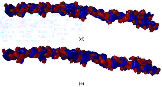 Electrostatic potential maps determined for selected structures of Collagen (a) and chitosan DD = 25% (b), DD = 50% (c), DD = 75% (d), and DD = 100% (e). Blue color stands for the positive charge, white red color denotes negative charge.