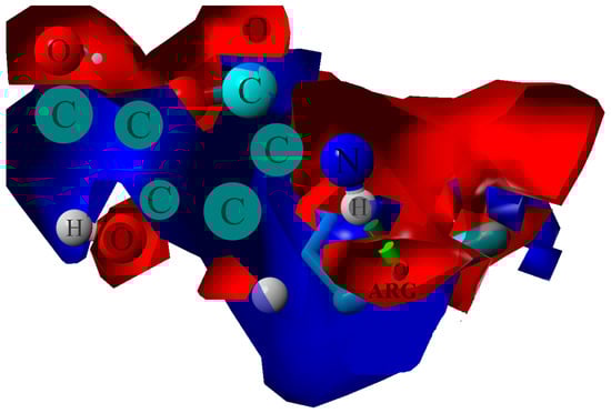 Electrostatic potential map determined for ARG–chitosan (DD = 87.5%) contact. The blue color stands for the positive charge, and the red denotes the negative charge. The green dotted line indicates H-bond.