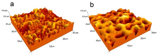 3D visualization of typical 30 µm × 30 µm (4 µm z-scale) AFM images of (a) Nb200V60s and (b) Nb250V60s samples.
