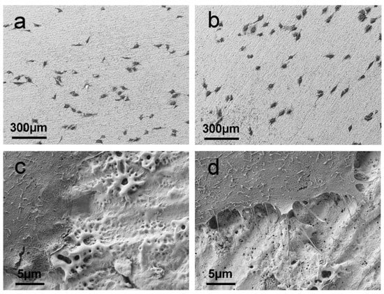SEM images at (a,b) low and (c,d) high magnification of MG-63 osteosarcoma cells after 48 h incubation on (a,c) Nb200V and (b,d) Nb200V + etching.