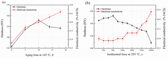 Hardness and electrical conductivity of the sample under DA and 295 °C isothermal conditions: (a) DA condition; (b) 295 °C isothermal condition.