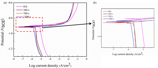 Polarization curves of the alloy under DA and isothermal treatment: (a) polarization curves; (b) enlarged details.