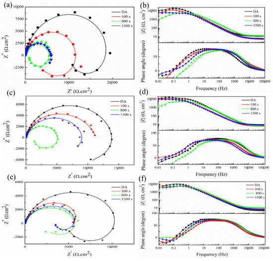 The Nyquist image including two parts: the Capacitive Loop (CL) in high frequency and the Inductive Loop (IL) in low frequency. The CL arc is considered to be related to the charge transfer reaction between the electric double layer on the surface of the corrosion medium interface. The IL arc relates to the weakening of the protective effectiveness of the oxide layer during the anodic dissolution of the aluminum alloys [26]. As shown in Figure 7, with prolonging the immersion time, the oxide film is eroded and becomes thinned, exposed to the corrosive medium. This process can be reflected in the Nyquist diagram that shows the continuous reduction of the IL arc and the significant shrinking of the CL arc with the extension of the immersion time, which indicates that the corrosion rate increases. It is worth noting that the alloy under DA state has the largest capacitive arc at the initial stage of the corrosion, while the alloy under 800 s isothermal holding time has the smallest capacitive arc. The large arc represents good corrosion resistance, and the alloy under DA state has the best corrosion resistance at the beginning of the corrosion. It can be seen from Figure 7b,d that only one phase peak appears in the mid-frequency stage (10 Hz to 103 Hz), which means that the corrosion mainly extends downward from the surface layer in the former 48 h immersion [27]. However, with the prolonging of the immersion time, another phase peak is shown in the low-frequency stage (0.01 Hz to 0.1 Hz), as shown in Figure 7f. The appearance of the second peak means that the exposed new alloy surface begins to be corroded, as the original metal surface continues to decrease. At the same time, the phase angle gradually decreases with extending the corrosion time, which also demonstrates the attenuation in the corrosion resistance.
