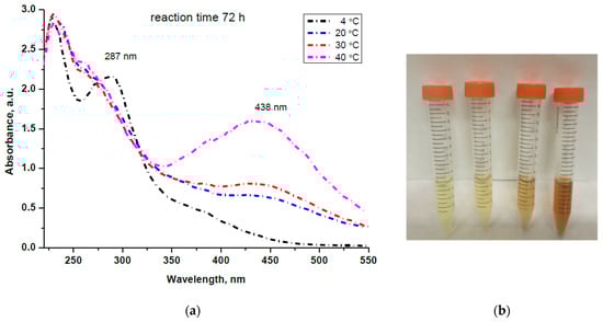 The formation of AgNPs by reduction with enzyme extract from T. reesei fungi was studied at temperatures of 4, 20, 30 and 40 °C without stirring and monitored using UV–Vis spectroscopy. Based on regular 24 h measurements and our previous experimental results reported elsewhere [], we chose to examine the reaction mixtures at the 72nd and 144th h of reaction duration and to isolate the AgNPs from the organic liquor for further characterization. Figure 1a depicts the absorption spectra of the reaction mixtures kept at different temperatures for a 72 h reaction time, and Figure 1b visualizes the color changes of the same samples, which were noticeable even on the first day. It can be seen that the intensity of the peak centered at 438 nm, which is assigned to the plasmon resonance of metallic Ag [], increases with the temperature, and it is well pronounced for the sample obtained at 40 °C.
