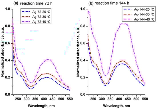 The AgNPs formed at the 72 h and 144 h reaction times from the enzyme-induced reaction were isolated, washed with water and re-dispersed in distilled water. Figure 2 shows the absorption spectra of the aqueous dispersions of the AgNPs formed at 20, 30 and 40 °C and isolated from the reaction mixture after 72 h (Figure 2a) and 144 h reaction times (Figure 2b). The absorption bands are observed at 415 nm without a significant shift of the band maximum, suggesting that the particle size and distribution are not drastically changed in the temperature range of 20–40 °C.