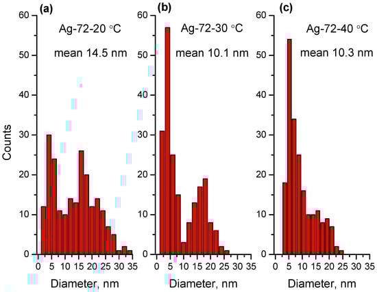 Size distribution for the samples (a) Ag-72-20 °C, (b) Ag-72-30 °C and (c) Ag-72-40 °C.