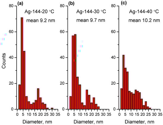 Size distribution for the samples (a) Ag-144-20 °C, (b) Ag-144-30 °C and (c) Ag-144-40 °C.