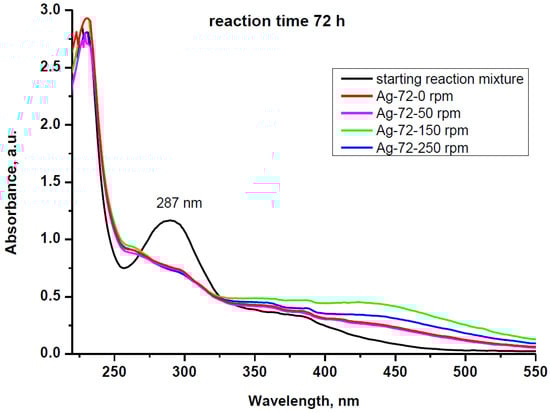 UV–Vis spectra of the starting reaction mixture and the reaction mixtures kept under static conditions (Ag-72-0 rpm) and stirring with different rotation speeds (50, 150 and 250 rpm) for reaction time 72 h. The temperature was kept constant (30 ± 1 °C).