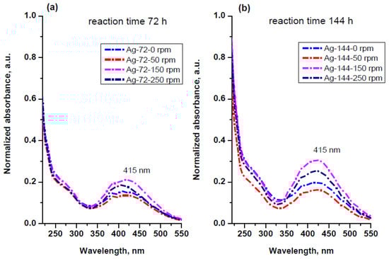 UV–Vis spectra of the aqueous dispersions of AgNPs isolated from the reaction mixtures stirred at 0, 50, 150 and 250 rpm after (a) 72 h reaction time and (b) 144 h reaction time.